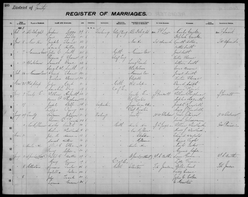 | Dec. 8, 1914 | St. Jones Within | Wm. Geo. BLUNDON | 28 | Bachelor | Fishing | Methodist | Hatchet Cove | Cater Winsor | Elijah Blundon |