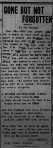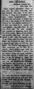 CHURCHILL, John – Hillview, Trinity Bay – There passed peacefully away on Jan. 3rd [1918], Mr. John Churchill, who had reached the age of 60 years, leaving a wife, three daughters, two sons, seven grandchildren, three brothers and one sister to mourn him. He was a lay reader in St. Michael’s Church for over twenty years, and did all that one could do to please the congregation. He was loved by all who knew him. He also occupied that position in Bunyan’s Cove, B.B., for three years. Many of his friends will greatly miss him. He was not afraid to die. His last words were: “I am going home to Jesus.” No doubt death was welcome to him. We have a blessed hope that we will see him again. His funeral took place on Feb. 10th, conducted by the Rev. W. A. Butler, whose sermon was from St. John’s Gospel 14 chap., 1 verse: “In my father’s house are many mansions, if it were not so I would have told you, I go to prepare a place for you.” The hymn at the graveside was “On the Resurrection morning.” His funeral was attended by a large gathering of relatives and friends to pay their last respects. May God … the mourners in the longely …