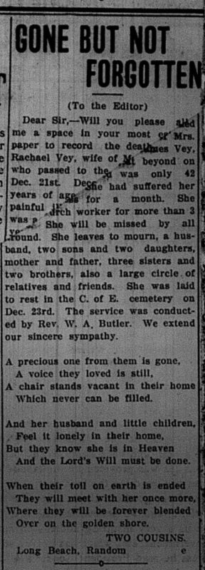 VEY, Rachel (nee Smith) – Gone but not Forgotten. (To the Editor). Dear Sir, – Will you please allowed me space in your most … paper to record the death of Mrs. Rachel Vey, wife of Mr. James Vey, who passed to the beyond on Dec. 21st. She was only 42 years of age. She had suffered her painful illness for a month. She was a … worker for more than 3 years. She will be missed by all round. She leaves to mourn, a husband, two sons and two daughters, mother and father, three sisters and two brothers, also a large circle of relatives and friends. She was laid to rest in the C. of E. cemetery on Dec. 23rd. The service was conducted by Rev. W.A. Butler. We extend our sincere sympathy.