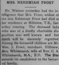 A message received by Mr. Watson yesterday announces the death, on Saturday last at Hillview, T.B., of Mrs. Frost, widow of the late Nehemiah Frost, Esq., J.P. The deceased lady was of a most charaitable and hospitable nature and had many friends here and throughout Trinity Bay who will regret to hear of her death. Her husband predeceased her a few years ago. Among her children left to mourn her are Mr. William J. Frost, merchant of Hillview and Mrs. Whitemarsh, wife of the Rev. C.A. Whitemarsh, B.D. We extend our sympathy with the relatives of the deceased. (Evening Telegram, July 9, 1918)