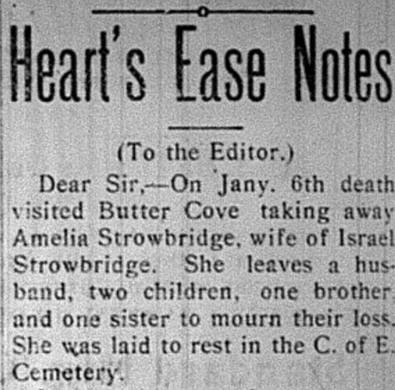 STROWBRIDGE, Amelia (nee Langer) –  On Jany 6th [1919] death visited Butter Cove taking away Amelia Strowbridge. wife of Israel Strowbridge. She leaves a husband, two children, one brother, and one sister to mourn their loss. She was laid to rest in the C. of E. Cemetery. (Evening Advocate, January 28, 1919, Heart’s Ease Notes)