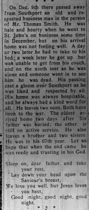 SMITH, Thomas – On Dec. 9th [1918] there passed away from Southport an old and respected business man in the person or Mr. Thomas Smith. He was hale and hearty when he went to St. John’s on business some time in December, but on his arrival home was not feeling well. A day or two later he had to take to his bed; a week later he got up but was unable to get from his couch, and on the ninth inst. as he was alone and someone went in to see him he was dead. His passing cast a gloom over Southport as he was liked and respected by all. His home was always hospitable, and he always had a kind word for all. He leaves two sons. Both have been to war. The eldest arrived home two days after his father was buried; the other is still on active service. He also leaves a brother and two sisters. He was in his 67th year. Let us hope that when the end came he was ready and trusting in his God.