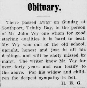 VEY, John – The passed away on Sunday at Southport, Trinity Bay, in the person of Mr. John Vey, one whom for good sterling qualities it is hard to beat. Mr. Vey was one of the old school, upright, honest and just in all his dealings, and will be sadly missed by many. The writer knew Mr. Vey for over forty years and can testify to the above. For his widow and children the deepest sympathy is felt. (The Evening Telegram, September 4, 1916)
