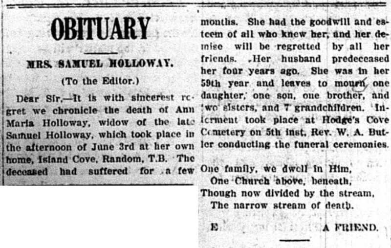 HOLLOWAY, Ann Maria (nee Smith) – Mrs. Samuel Holloway (To the Editor) Dear Sir,- It is with sincerest regret we chronicle the death of Ann Maria Holloway, widow of the late Samuel Holloway, which took place in the afternoon of June 3rd at her own home, Island Cove, random, T.B. The deceased had suffered for a few months. She had the good will and esteem of all who knew her, and her demise will be regretted by all her friends. Her husband predeceased her four years ago. She was in her 59th year and leaves to mourn one daughter, one son, one brother, and two sisters, and 7 grandchildren. Increment on the 5th inst. Rev. W.A. Butler conducting the funeral ceremonies.