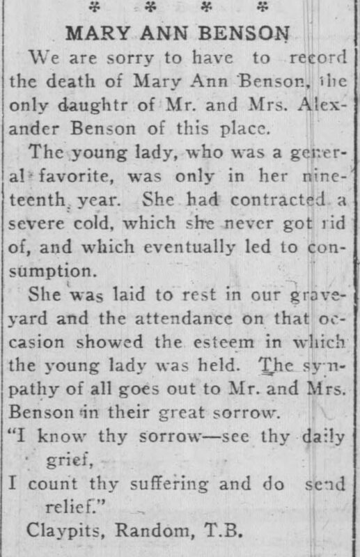BENSON, Mary Ann – We are sorry to have to record the death of Mary Ann Benson, the only daughter of Mr. and Mrs. Alexander Benson of this place. The young lady, who was a general favorite, was only in her nineteenth year. She had contracted a severe cold, which she never got rid of, and which eventually led to consumption. She was laid to rest in our grave yard and the attendance on that occasion showed the esteem in which the young lady was held. The sympathy of all goes out to Mr. and Mrs. Benson in their great sorrow. “I know thy sorrow – see thy daily grief. I count thy suffering and do send relief.” Claypits, Random, T.B. (St. John’s Daily Star, May 21, 1918)