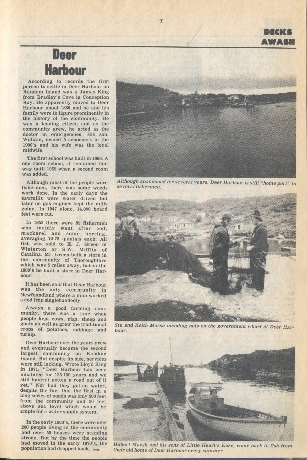 According to records the first person to settle in Deer Harbour on Random Island was a James King from Bradley’s Cove in Conception Bay. He apparently moved to Deer Harbour about 1866 and he and his family were to figure prominently in the history of the community. He was a leading citizen and as the community grew, he acted as the doctor in emergencies. His son, William, owned 5 schooners in the 1900’s and his wife was the local midwife.