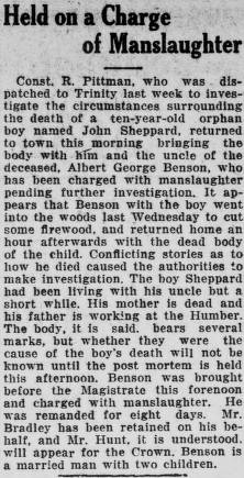 Const. R. Pittman, who was dispatched to Trinity last week to investigate the circumstances surrounding the death of a ten-year-old orphan boy named John Sheppard, returned to town this morning bringing the body with him and the uncle of the deceased, Albert George Benson, who has been charged with manslaughter pending further investigation. It appears that Benson with the boy went into the woods last Wednesday to cut firewood, and returned home an hour afterwards with the dead body of the child. Conflicting stories as to how he died caused the authorities to investigation. The boy Sheppard had been living with his uncle but a short while. His mother is dead and his father is working at the Humber. The body, it is said, bears several marks, but whether they were the cause of the boy’s death will not be known until the post mortem is held this afternoon. Benson was brought before the Magistrate this forenoon and charged with manslaughter. He was remanded for eight days. Mr. Bradley has been retained on his behalf, and Mr. Hunt, it is understood, will appear for the Brown. Benson is a married man with two children.