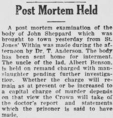 Post mortem examination of the body of John Sheppard which was brought to town yesterday from St. Jones’ Within was made during the afternoon by Dr. T. Anderson. The body has been sent home for interment. The uncle of the lad, Albert Benson, is held on remand charged with manslaughter pending further investigation. Whether the charge will remain as at present or be increased to a capital charge of murder depends on that view the Crown will take of the doctor’s report and statements which the prisoner is said to have made.