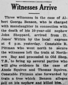 Three witnesses in the case of Albert George Benson, who is charged with the manslaughter in the death of his 10-year-old nephew John Sheppard, arrived from St. Jones’ Within by the local express at 6 p.m. yesterday. Constable R. Pittman who went north to secure the witnesses left the train at Northern Bay and proceeded to Old Shop, T.B., to bring up several parties who will give evidence in the case of Annie Squires and Thomas Squires. Constable Pittman also forwarded by train a tree which Benson alleges fell on his nephew and killed him.