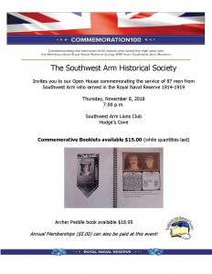 The Southwest Arm Historical Society Invites you to our Open House commemorating the service of 87 men from Southwest Arm who served in the Royal Naval Reserve 1914-1919 Thursday, November 8, 2018 at 7:00 p.m. Southwest Arm Lions Club, Hodge’s Cove Commemorative Booklets available $15.00 (while quantities last) Archer Peddle book will also be available. […]