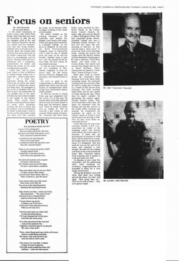 In the small community of Ivany’s Cove, near North West Brook, Abel Churchill was born on November 15, 1897. He was the youngest child of Mr. and Mrs. Thomas Churchill. He had two sisters and two brothers, with only one living brother, Obediah who is 83 and lives in Detroit, Mich. His mother died when he was seven years old, so his father raised him with the help of a housekeeper and his family. Thomas Churchill was a fisherman and a woodsman, summertime he fished and during the winter he cut wood and operated a sawmill.