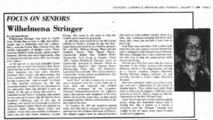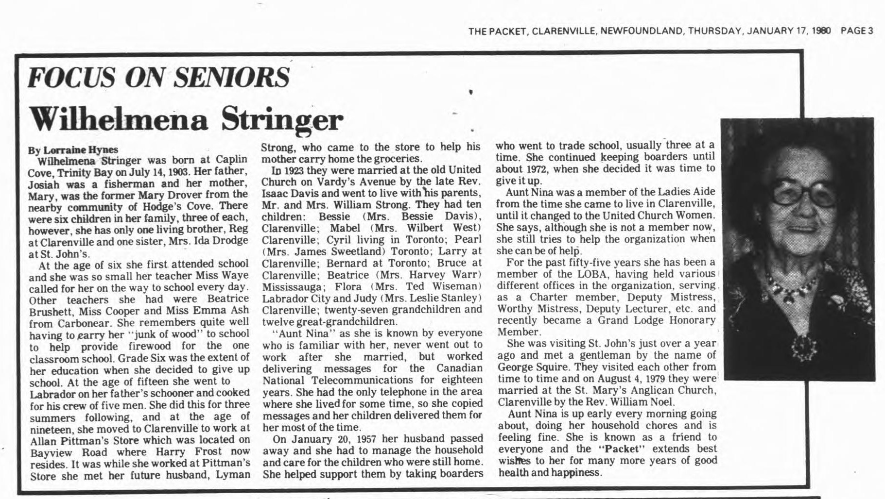 Wilhelmena Stringer was born at Caplin Cove, Trinity Bay on July 14, 1903. Her father, Josiah was a fisherman and her mother, Mary, was the former Mary Drover from the nearby community of Hodge’s Cove. There were six children in her family, three of each, however, she has only one living brother, Reg at Clarenville and one sister, Mrs. Ida Drodge at St. John’s.