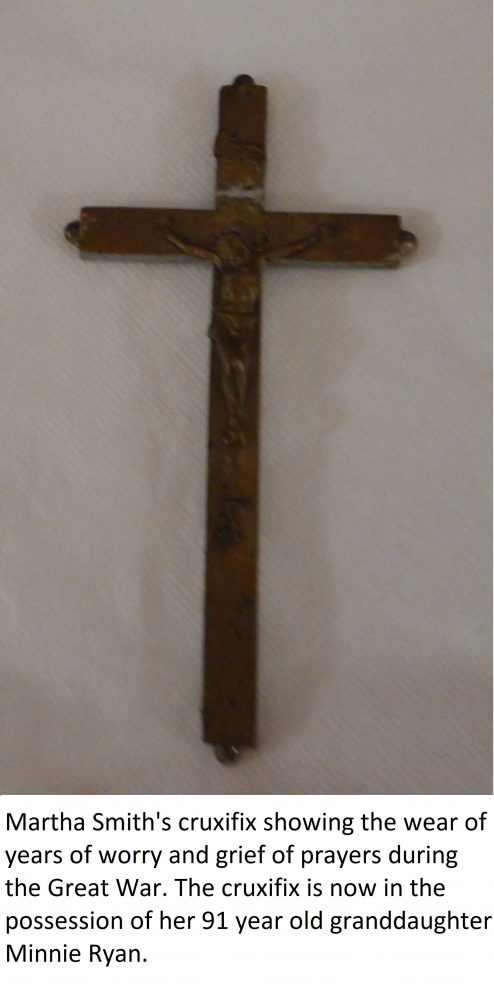 Martha Smith of Gooseberry Cove was one such individual. Losing her husband two months after witnessing four of her sons enlisting on August 3, 1914, would have caused many of us feel abandon by God. Her granddaughter, Minnie Ryan, explains that her grandmother was a religious woman that would have prayed constantly for the safe return of her sons while holding the crucifix. She took comfort in knowing that three children were still at home James, Isaac, and Alice.