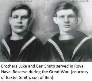 Luke was the first brother to enlist in March, 1906. He completed seven year of service before the outbreak of the Great War. He saw his earlier enlistment as means of earning extra income during the winter months. John followed Luke and enlisted in December, 1910 and completed five years naval training. Two more brothers, Ben and Uriah enlisted when the Naval Reserve requested volunteers at the outbreak of the war. Unlike Ben, Uriah was living at Massachusetts at the time he signed his enlistment papers.