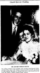 The wedding of Melvie Louisa, daughter of Mr. and Mrs. David Spurrell of Butter Cove, Trinity Bay, to Mr. Norman Chaulk, son of Mr. and Mrs. Job Chaulk of Little Catalina, took place on February 23rd, 1957, at the Church M St Edmund the Martyr, Toronto—Ottawa Studio, Toronto (Daily News, April 9, 1957)