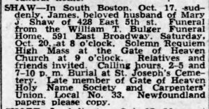 SHAW, James – In South Boston, Oct. 17, [1951] suddenly, James beloved husband of Mary J. Shaw of 428 East 5th st. Funeral from the William T. Bulger Funeral Home, 591 East Broadway, Saturday, Oct. 20, [1951] at 8 o’clock. Solemn Requiem High Mass at the Gate of Heaven Church at 9 o’clock. Relatives and friends invited. Calling hours 2-5 and 7-10 p.m. Burial at St. Joseph Cemetery. Late member of Gate of Heaven Holy Name Society and Carpenters’ Union. Local No. 33. Newfoundland papers please copy. (Reprinted from the Boston Globe, October 19, 1951)_________________________