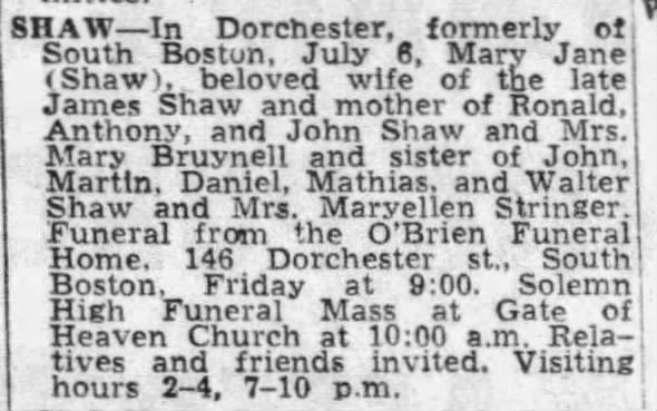 SHAW, Mary Jane (nee Shaw) – In Dorchester, formerly of South Boston, July 6, Mary Jane (Shaw), beloved wife of the late James Shaw and mother of Ronald, Anthony, and John Shaw and Mrs. Mary Bruynell and sister of John, Martin, Daniel, Mathias, and Walter Shaw and Mrs. Maryellen Stringer. Funeral from the O’Brien Funeral Home, 146 Dorchester st., South Boston, Friday at 9:00. Solemn High Funeral Mass at Gate of Heaven Church at 10:00 a.m. Relatives and friends invited. Visiting hours 2-4, 7-10 p.m. (Reprinted from The Boston Globe, Thu, July 8, 1965)