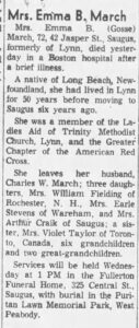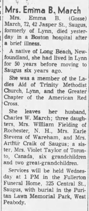 MARCH, Emma B. (Gosse) – 72, 42 Jasper St., Saugus, formerly of Lynn, died yesterday [April 5, 1964] in a Boston hospital after a brief illness. A native of Long Beach, Newfoundland, she had lived in Lynn for 50 years before moving to Saugus six years ago. She was a member of the Ladies Aid of Trinity Methodist Church Lynn, and the Greater Chapter of the American Red Cross. She leaves her husband, Charles W. March; three daughters, Mrs. William Fielding of Rochester, N.H., Mrs. Earle Stevens of Wareham, and Mrs. Arthur Craik of Saugus; a sister, Mrs. Violet Taylor of Toronto, Canada, six grandchildren and two great-grandchildren. Services will be held Wednesday at 1 p.m. in the Fullerton Funeral Home, 325 Central st., Saugus, with burial in the Puritan Lawn Memorial Park, West Peabody. (Reprinted from The Daily Item, Lynn, Massachusetts, April 6, 1964)