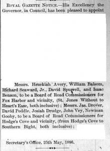 Royal Gazette Notice:– His Excellency the Governor, in Council, has been pleased to appoint … Messrs. Hezekiah Avery, William Balsom, Richard Seaward, Jr., David Spurrell, and Isaac Benson, to be a Board of Road Commissioners for Fox Harbour and vicinity, (St. Jones Without to Heart’s Ease, both inclusive); Messrs. Jas Drover, David Peddle, Josiah Drudge, John Vey, Newman Gooby, to be a Board of Road Commissioners for Hodge’s Cove and vicinity, (from Hodge’s Cove to Southern Bight, both inclusive); …