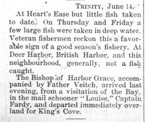 Trinity, June 14. At Heart’s Ease but little fish taken to date. On Thursday and Friday a few large fish were taken in deep water. Veteran fishermen reckon this a favorable sign of a good season’s fishery. At Deer Harbor, British Harbor, and this neighbourhood, generally, not a fish caught.