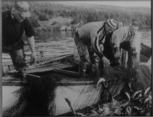 Azariah King, Clarence King, and Ralph Drodge hauling a codtrap off Hatchet Cove. Courtesy Clarence King.