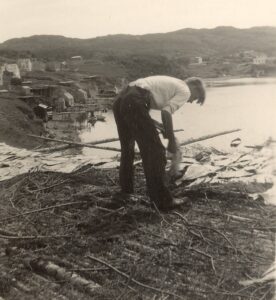 A typical summer’s day would start with the early morning fog retreating from the hills and the smell of freshly cut homemade bread being toasted. The toaster was often a two-sided gadget on which both sides came down, and only one side of the bread was toasted. Some might recall a coat hanger twisted, moulded, and placed on the old wood stove. It made an inventive device for toasting bread but required constant supervision; the kitchen could quickly fill with smoke from burning toast. A cup of instant coffee or freshly steeped tea would help wash down the toast. Outside we’d listen for the familiar morning sounds: a mixture of seagulls, steering, crows and the putt-putt of the old make-and-break engine echoing off the harbour cliffs as the first boats returned.