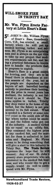 ST. JOHN’S – Mr. William Flynn of Heart’s Ease, Gooseberry Cove, T.B., has erected a small factory where he will put up smoked herring, turbot and salmon. Mr. Flynn is an enterprising man and is always on the qui vive to take up any project that modern requirements call for, and being a practical fishermen he knows how to handle the products that he proposes to exploit.