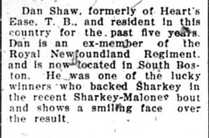 Dan Shaw, formerly of Heart’s Ease, T. B., and resident in this country for the past five years. Dan is an ex-member of the Royal Newfoundland Regiment and is now located in South Boston. He was one of the lucky winners who backed Sharkey in the recent Sharkey-Maloney bout and shows a smiling face over the result.