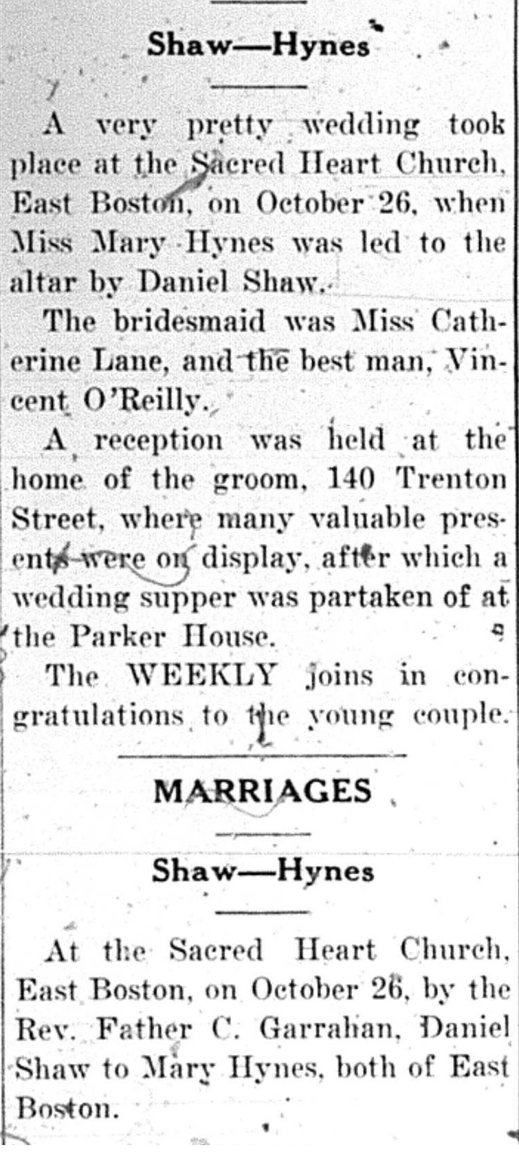 At the Scared Heart Church East Boston, on October 26, by the Rev. Father C. Garrahan, Daniel Shaw to Mary Hynes, both of East Boston.