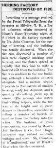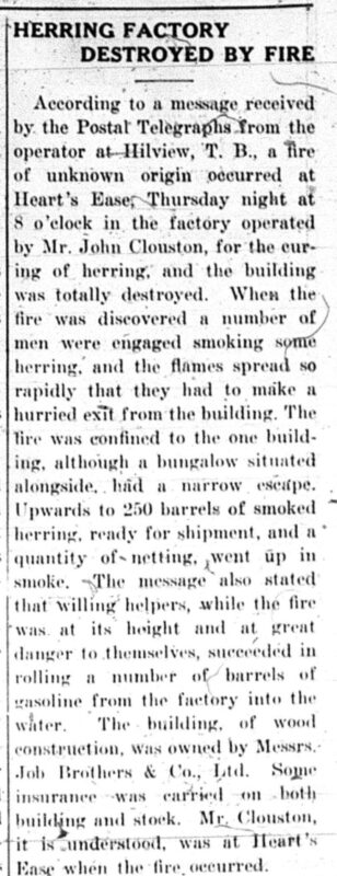 According to a message received by the Postal Telegraphs from the operator at Hillview, T. B., a fire of unknown origin occurred at Heart’s Ease, Thursday night at S o’clock in the factory operated by Mr. John Clouston, for the curing of herring, and the building was totally destroyed. When the fire was discovered a number of men were engaged smoking some herring, and the flumes spread so rapidly that they had to make a hurried exit from the building. The fire was confined to the one building. although a bungalow situated alongside, had a narrow escape. Upwards to 250 barrels of smoked herring, ready for shipment, and a quantity of netting, went up in smoke. The message also stated that willing helpers, while fire was at its height and at great danger to themselves, succeeded in rolling a number of barrels of gasoline from the factory into the water. The building, of wood construction, was owned by Messrs Job Brothers & Co., Ltd. Some insurance was carried on both building and stock. Mr. Clouston. it is understood, was at Heart’s Ease when the fire occurred.