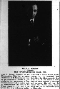 Alan G. Benson, President of the Newfoundland Club, Inc., is a native of Hillview, T. B. For some five years he was Collector of Customs at Clarenville and later was engaged in Government survey work in various parts of Newfoundland. He came to the United States in 1921, and at the present time is a professional auditor on the staff of Messrs. Barrow, Wade, Guthrie Co., 170 Broadway, New York City, the oldest accounting firm in the U. S. A. Mr. Benson is prominent in many activities in Brooklyn and elsewhere. His wife was the former Miss Violetta Janes, daughter of Mrs. and the late George Janes of Clarenville.