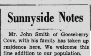 Mr. John Smith of Gooseberry Cove, with his family has taken up residence here. We welcome this fine addition to our population.