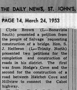 Clyde Brown (L-Bonavista South) presented a petition from the people of Salvage requesting construction of a bridge. Hon. S. J. Hefferon (L-Trinity North) presented two petitions for the completion and construction of roads in his district. The first was from Hodge’s Cove and the second for the construction of a road between Hatchet Cove and Hillview to connect the Cabot highway.