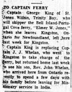 Captain George King of St. Jones Within, Trinity Bay, who will skipper the Bell Island – Portugal Cove ferry, “Elmer W. Jones,” when she leaves Kingston, Ontario for Newfoundland, left here last week for Kingston.