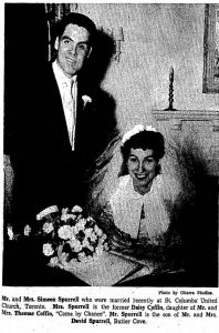 Mr. and Mrs. Simeon Spurrell who were married recently at St Columbia United Church, Toronto. Mrs. Spurrell is the former Daisy Coffin, daughter of Mr. and Mrs. Thomas Coffin, Come by Chance. Mr. Spurrell is the son of Mr. and Mrs. David Spurrell, Butter Cove.