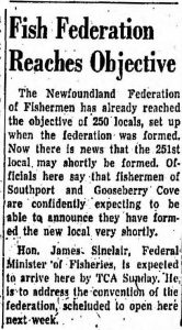 The Newfoundland Federation of Fishermen has already reached the objective of 250 locals, set up when the federation-was formed. Now there is news that the 251st local, may shortly be formed. Officials here say that fishermen of Southport and Gooseberry Cove are confidently expecting to be able to announce they have formed the new local very shortly.