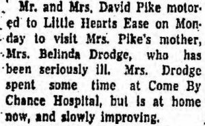 Mr. and Mrs. David Pike motored to Little Hearts Ease on Monday to visit Mrs. Pike’s mother, Mrs. Belinda Drodge, who has been seriously ill. Mrs. Drodge spent some time at Come By Chance Hospital, but is at home now, and slowly improving.