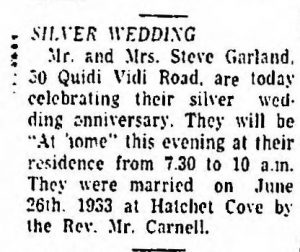 Mr. and Mrs. Steve Garland, 50 Quidi Vidi Road, are today celebrating their silver wedding anniversary. They will be “at home” this evening at their residence from 7:30 to 10 p.m. They were married on June 26th, 1933 at Hatchet cove by Rev. Mr. Carnell.