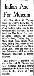 Mrs. Roy Allen, 41 Torbay Road, St. John’s East, has recently donated the Stone Head of an Indian battle axe to the Newfoundland Museum. It was found on May 24 of this year [1962], by David Benson of Little Heart’s Ease, Trinity Bay, at Black Duck Cove, North West Arm, Trinity Bay, where it was embedded in soft soil on Black Duck Cliff. This axe head is a most interesting addition to the Museum’s collection of Indian weapons.