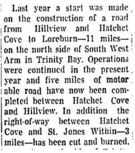 Last year a start was made on the construction of a road from Hillview and Hatchet Cove to Loreburn – 11 miles – on the north side of South West Arm in Trinity Bay. Operations were continued in the present year and five miles of motorable road have now been completed between Hatchet Cove and Hillview. In addition the right-of-way between Hatchet Cove and St. Jones Within – 3 miles – has been cut and burned.
