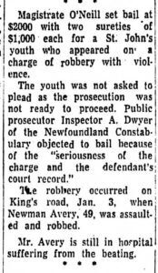 The youth was not asked to plead as the prosecution was not ready to proceed. Public prosecutor Inspector A. Dwyer of the Newfoundland Constabulary objected to bail because of the “seriousness of the charge and the defendant’s court record.”