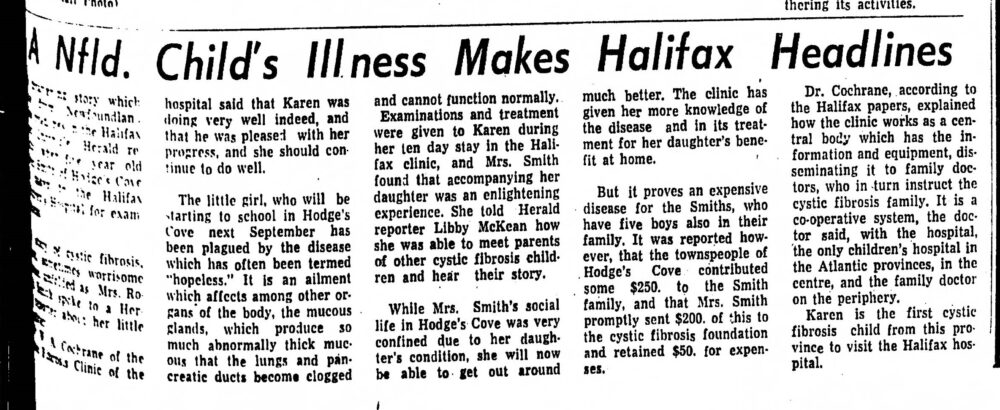 But it proves an expensive disease for the Smiths, who have five boys also in their family. It was reported however that the townspeople of Hodge’s Cove contributed some $250. to the Smith family and that Mrs. Smith promptly sent $200. of this to the cystic fibrosis foundation and retained $50. for expenses.