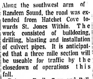 Along the southwest arm of the Random Sound, the road was extended from Hatchet Cove towards St. Jones Within. The work consisted of bulldozing, drilling, blasting and installation of culvert pipes. It is anticipated that a three mile section will be useable for traffic by the closedown of operations this fall.