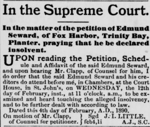 NOTICE IS HEREBY Given that application will be made to the Honorable the Supreme Court, or one of the Honorable Judges thereof, on Tuesday, the 22nd inst. (or as soon after as the Court can attend to the same), for a certificate of Insolvency and Final Discharge, to be granted to Edmund Seward, of Fox Harbor, Trinity Bay, planter.