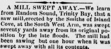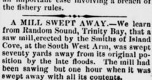 A mill swept away – We learn from Random Sound, Trinity Bay, that a saw mill, erected by the Smiths of Island Cove, at the South West Arm, was swept seventy yards away from the original position by the late floods. The mill had been sawing but one hour when it was swept away with all its contents.