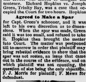 Richard Hopkins vs. Joseph Green, Trinity Ray, was a case that occupied the Court for two hours. Hopkins Agreed to Make a Spar for Capt. Green’s schooner, and it was left to his own discretion as to dimensions. When the spar was made, Green said it was too small, and refused to take it. Hopkins then brought the matter Into Court. The matter was postponed till to-morrow in order that plaintiff may bring rebuttal evidence to show that the spar was not rotten, an issue that came out in the course of the evidence, and on which plaintiff was not counting, the Question of size being the only objection. F. J. Mofrls for plaintiff; F. Mews for defendant. SUPREME COURT. » (Be/ore the Chief Justice.) B. Smith vs. W. B. Grieve* THE case of R. Smith versus W. B. Grieve, for erecting