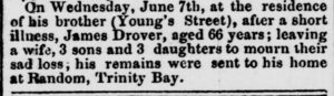 On Wednesday, June 7th, at the residence of his brother (Young’s Street), after a short illness, James Drover, aged 66 years; leaving a wife, 3 sons and 3 daughters to mourn their sad loss; his remains were sent to his home at Random, Trinity Bay.
