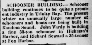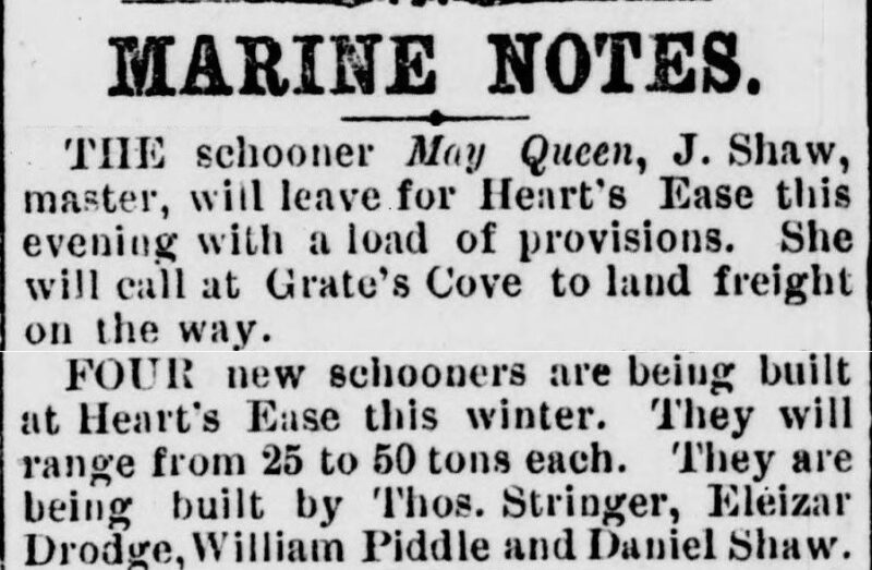 Four new schooners are being built at Heart’s Ease this winter. They will range from 25 to 50 tons each. They are being built by Thos. Stringer, Eleizar Drodge, William Piddle and Daniel Shaw.