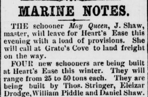 The schooner May Queen, J. Shaw, master, will leave for Heart’s Ease this evening with a load of provisions. She will call at Grate’s Cove to land freight on the way.