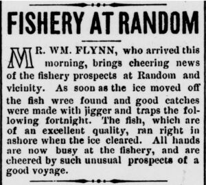 Mr. WM. Flynn, who arrived this morning, brings cheering news of the fishery prospects at Random and Vicinity. As soon as the ice moved off the fish wree found and good catches were made with jigger and traps the following fortnight. The fish, which are of an excellent quality, ran right in ashore when the ice cleared. All hands are now busy at the fishery, and are cheered by such unusual prospects of a good voyage.